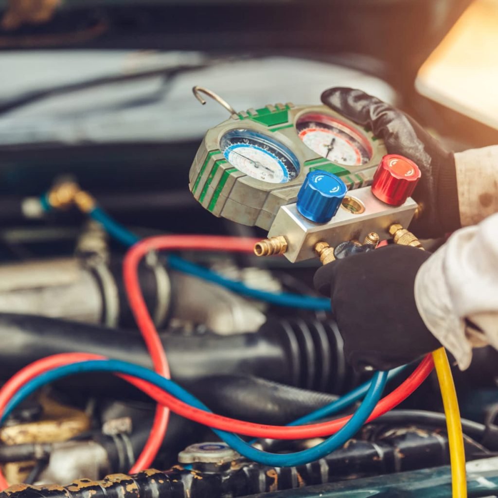 Servicing the air conditioning system, including recharging the system, fixing leaks, and replacing the compressor.
